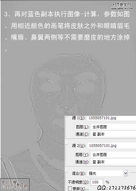 3、再對藍色副本執行圖像-計算,參數如圖。用相近顏色的畫筆將皮膚之外和眼睛眉毛、嘴唇、鼻翼兩側等不需要磨皮的地方涂掉。