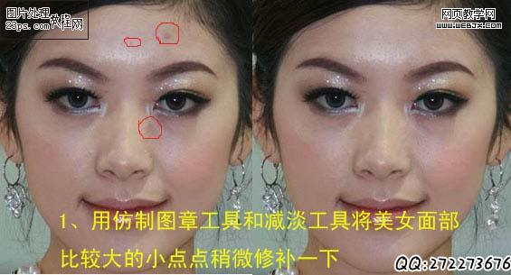 1、打開原圖素材,用仿制圖章工具和減淡工具將美女面部比較大的點點修補一下。