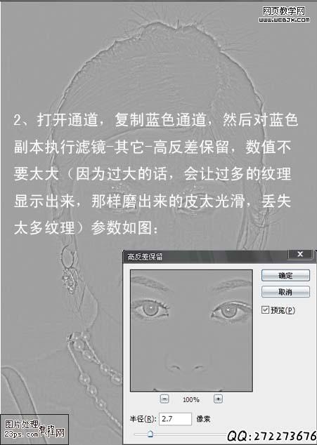 2、打開通道,復制藍色通道,然后對藍色副本執行濾鏡-其它-高反差保留,參數如圖: