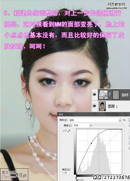 5、新建曲線調整層,對上一步的選區進行提亮,這時候看到mm的面部變亮了,而且臉上的小點點也基本沒有,呵呵!