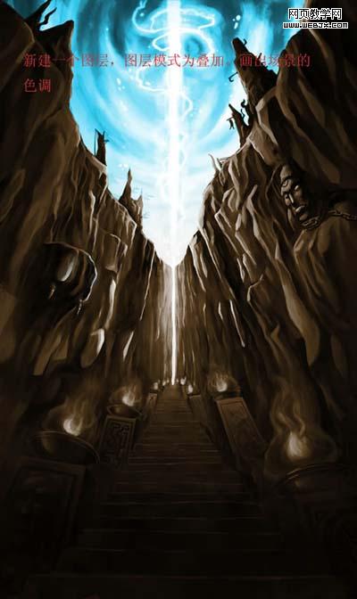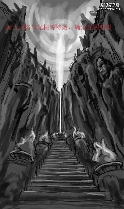 6、細化光柱效果,也可以再光柱上做一個外發光。將遠處的巖石虛化,分出前后關系,加強景深感。近處臺階用霧狀筆觸做出霧化效果,襯托場景七分。