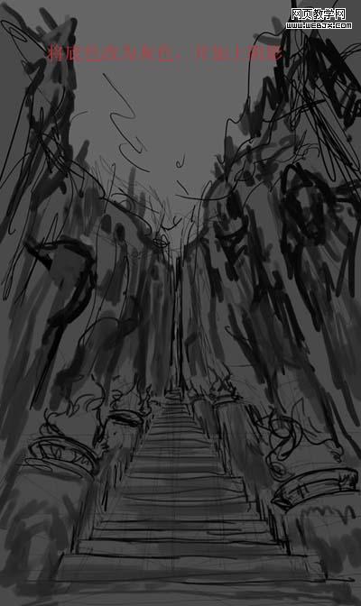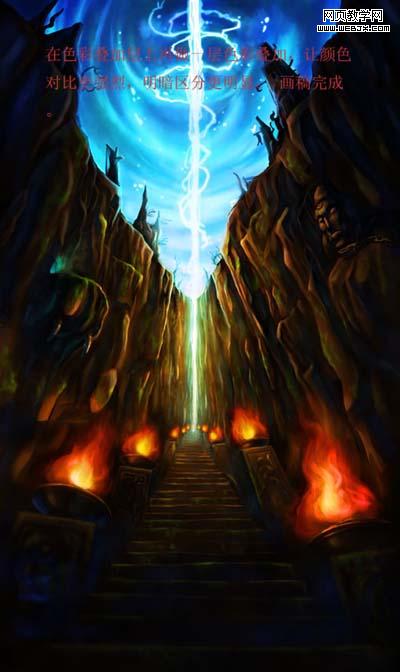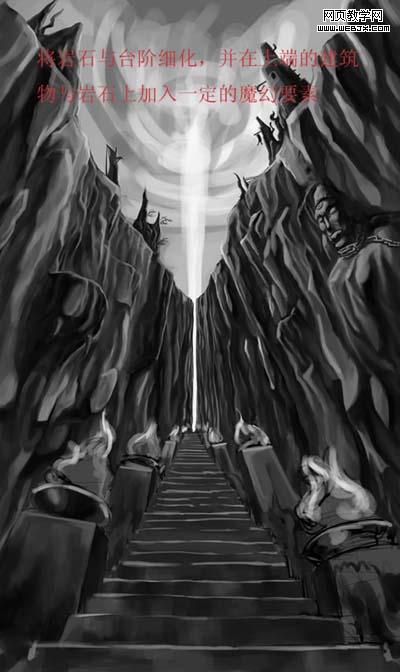 4、將巖石與臺階細化,并在上端的建筑物與巖石上加入一定的魔幻要素: