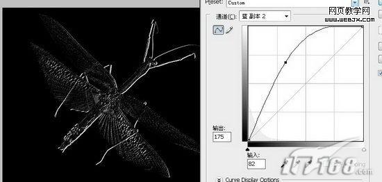 17、再復制藍通道副本層,執行菜單欄中的“圖像”→“調整”→“色階”命令,用黑色吸管吸取圖中的灰色。執行菜單欄中的“圖像”→“調整”→“曲線”命令,設置同上,效果如圖18所示。