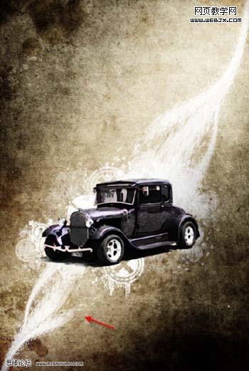 17、在背景副本圖層和汽車圖層之間,新建一個層,命名為污跡筆刷層,在污跡筆刷圖層,用下好的筆刷在汽車周圍隨意涂抹(改變筆刷的不透明度和流量制作出動感效果):