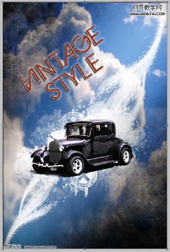 24、作為最后的修飾,我們添加些云彩。打開云層圖,按ctrl+a全選云彩圖,復制到廣告圖里,放在背景副本圖層和污跡筆刷圖層之間,調整云彩圖片的大小,如下圖所示: