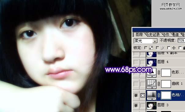 3、創建色相/飽和度調整圖層,參數設置如圖3勾選著色選項,確定后把圖層混合模式改為“柔光”,圖層不透明度改為:70%,效果如圖4。