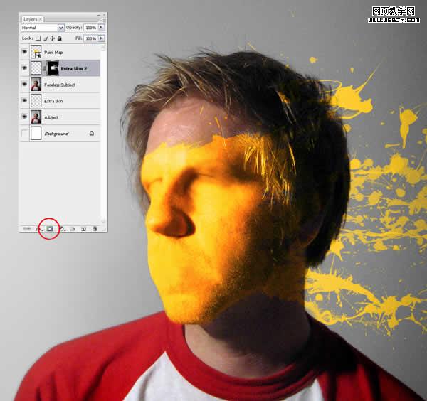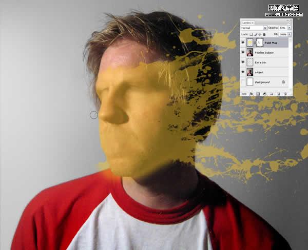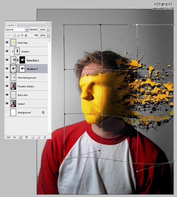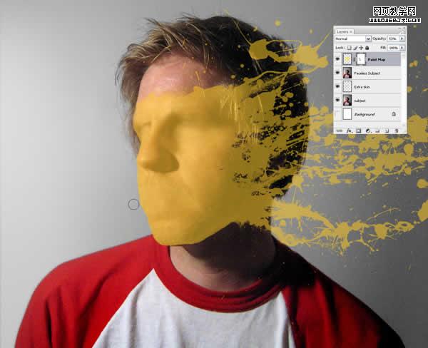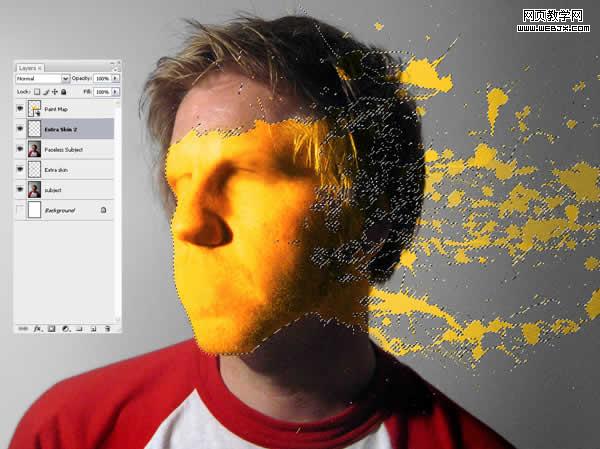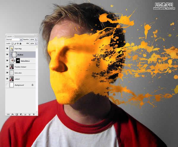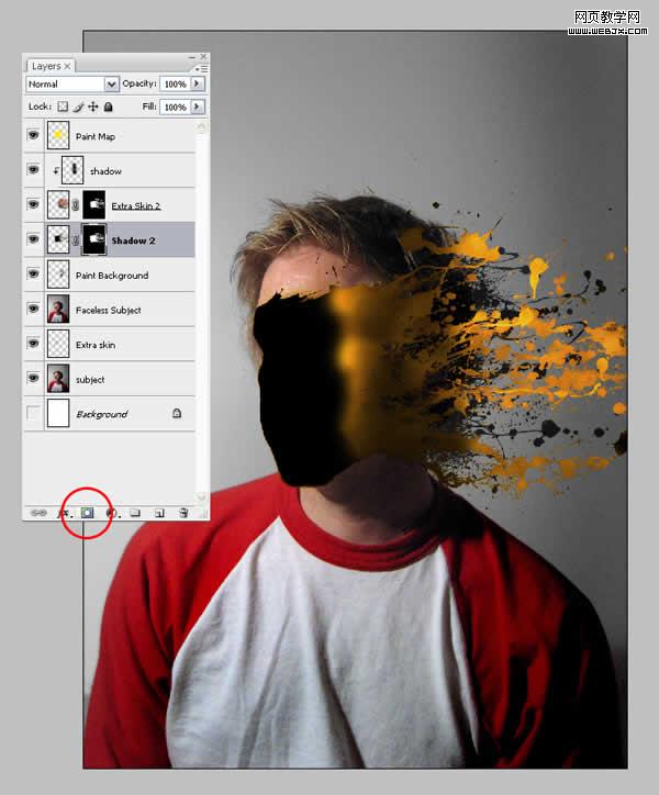 現在我們要做的加點陰影以造就油漆貼在臉上的錯覺。首先創建一個新層名為“shadow2”,然后ctrl在“paint map”上單擊以選中它。確保“shadow2”還在選中,用黑色填充。