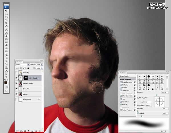 使“paint map”層不可見。在“extra skin2”層被選中的情況下,祭起你的圖章工具,將皮膚都扯成水滴……注意匹配你片子的光線;你正在創建一個基本的extra skin圖層,以后將會被上色。我發現把圖章工具的頂屬性欄的對齊關掉會比較有用。