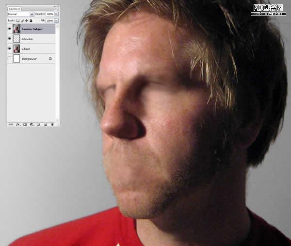 完成了抹平臉部特征之后,選中“subject”和“extra skin”圖層,alt+ctrl+e合并圖層,將這個圖層命名為“faceless subject”。