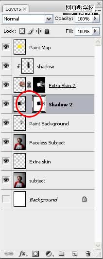 在“extra skin2”上方新疆一個圖層,名為“shadow”。按住alt,在“extra skin2”和“shadow”中間單擊,鏤空“shadow”層(就相當于加個超智能的蒙版)。