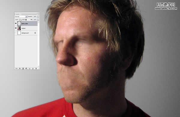 創建一個新層名為“extra skin”。然后使用圖章工具。在你認為顏色最匹配的皮膚位置alt+單擊以取樣然后使用軟筆刷來淡化邊緣。