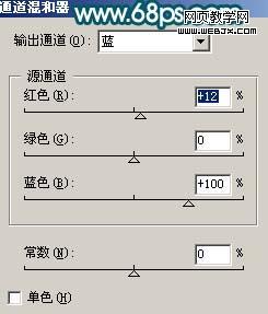 10、創建通道混合器調整圖層,對藍色進行調整,參數設置如圖15,效果如圖16。