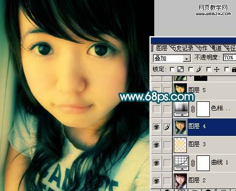 3、新建一個圖層,按ctrl + alt + shift + e 蓋印圖層,執行:濾鏡 > 模糊 > 高斯模糊,數值為5,確定后把圖層混合模式改為“疊加”,圖層不透明度改為:70%,如圖5。