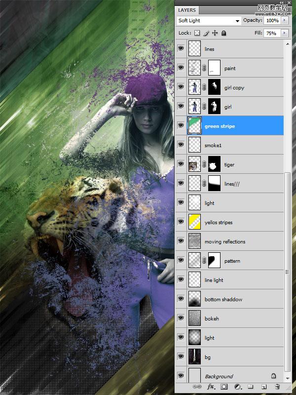 之后我們部分背景調(diào)整為綠色,然后設(shè)置圖層模式為柔光,填充調(diào)整到75%。