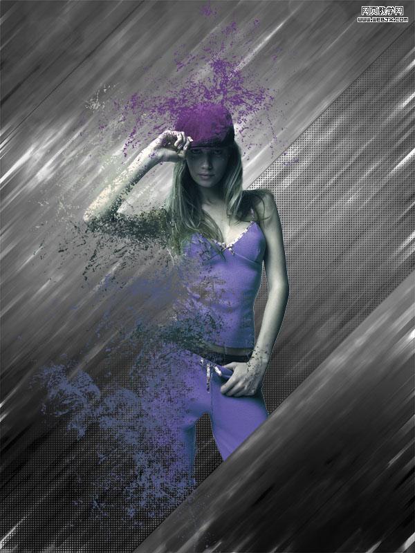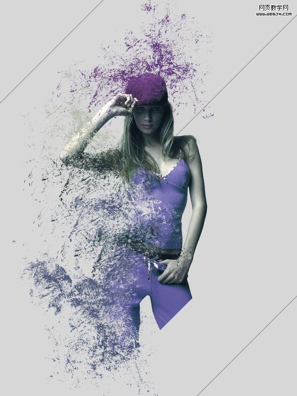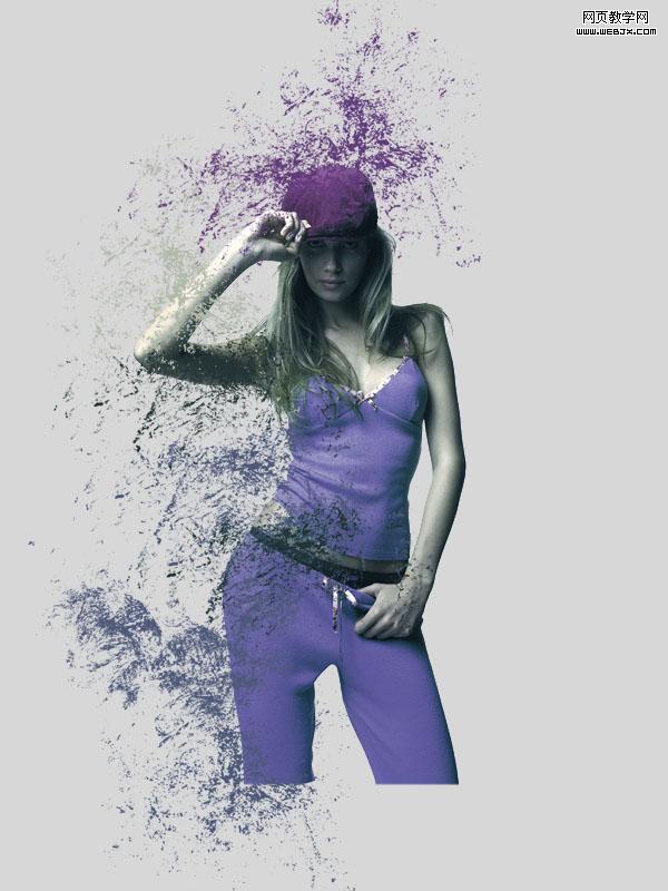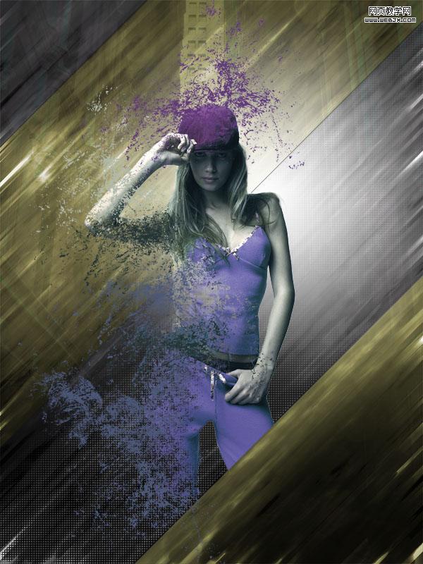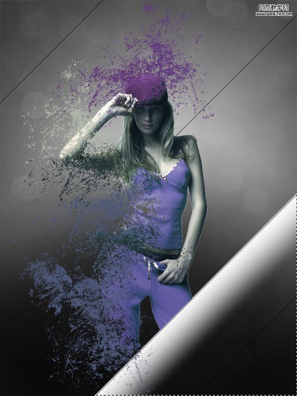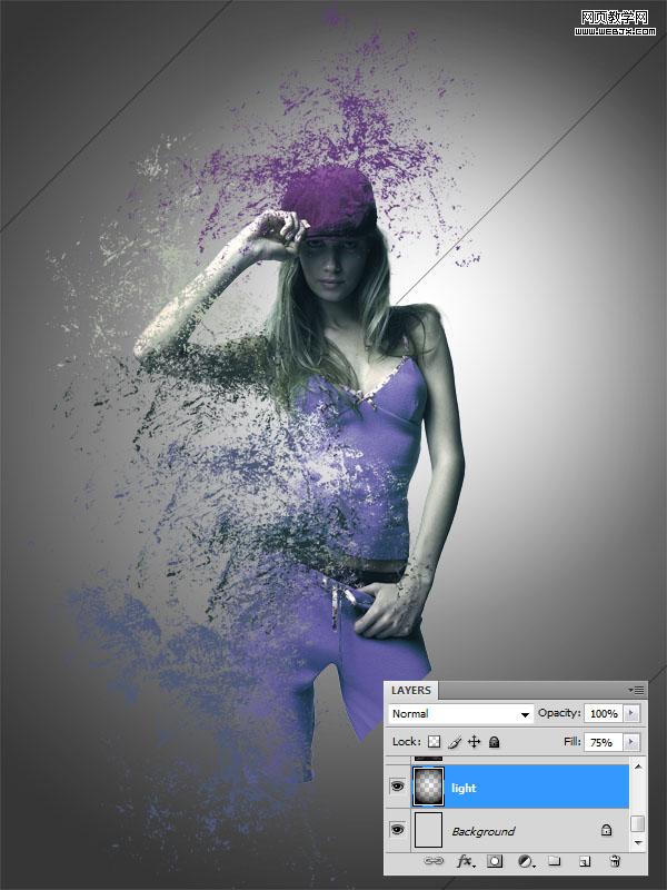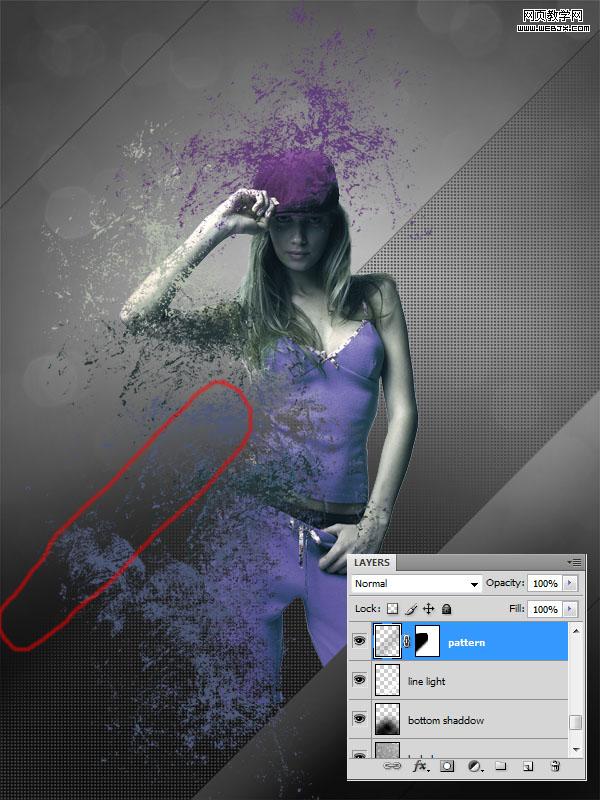 現(xiàn)在要讓圖片看起來(lái)更好了,回到女孩圖層去在圖層蒙版的左邊用grunge筆刷來(lái)添加一些黑色,看起來(lái)就像姑娘被涂掉了一塊,我還順便調(diào)整了一下腿部的邊緣和角度。
