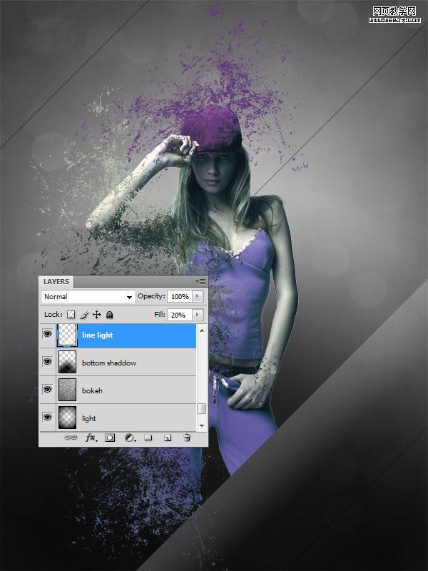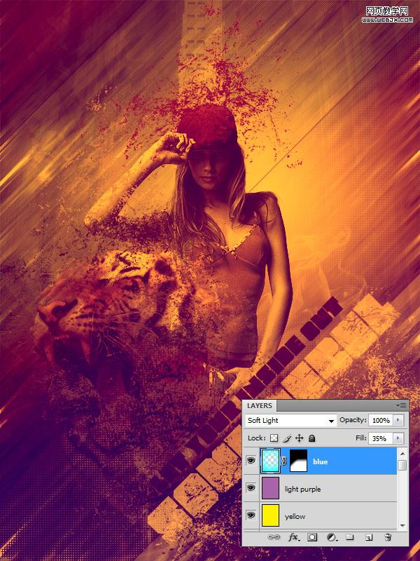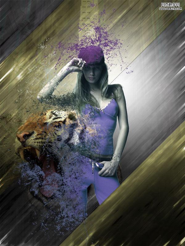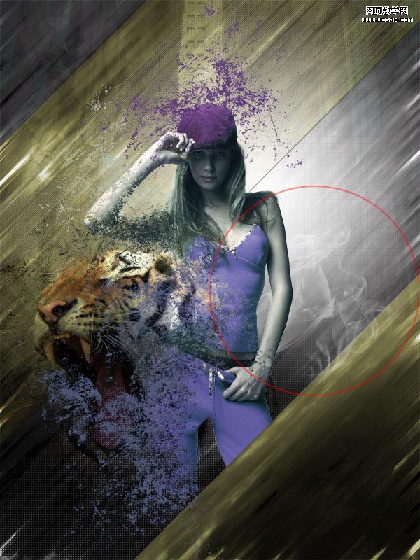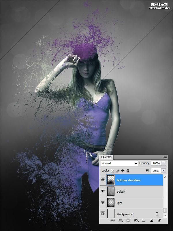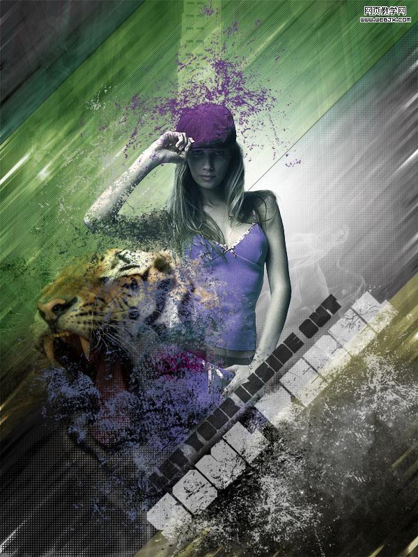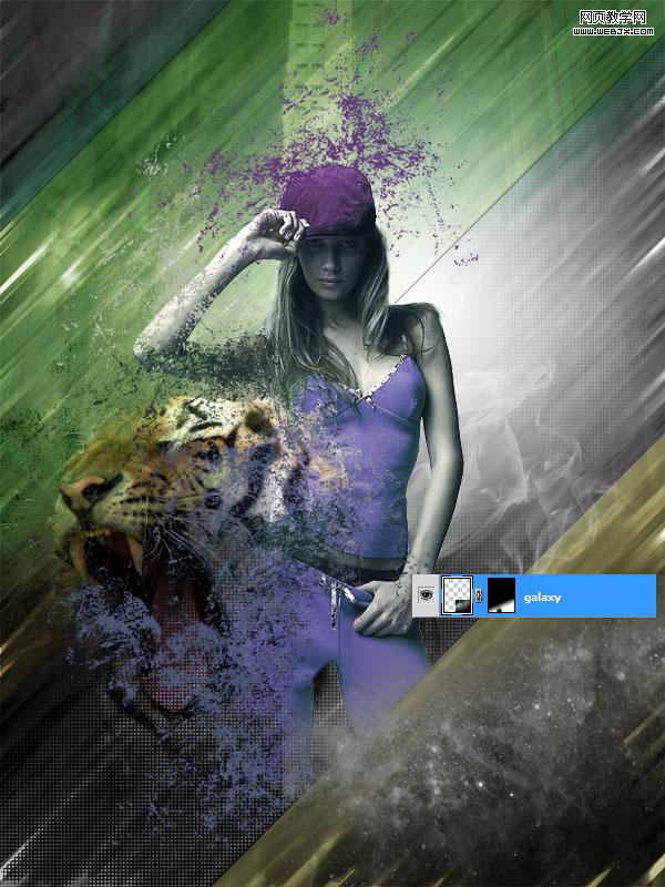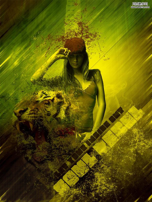 現(xiàn)在要讓圖片看起來(lái)更好了,回到女孩圖層去在圖層蒙版的左邊用grunge筆刷來(lái)添加一些黑色,看起來(lái)就像姑娘被涂掉了一塊,我還順便調(diào)整了一下腿部的邊緣和角度。