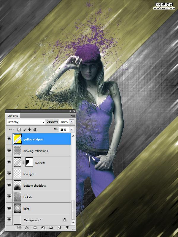 然后我們建立一個(gè)新圖層,然后應(yīng)用一些暗黃色的顏色圖案,設(shè)置圖層模式為疊加,填充調(diào)整到25%。