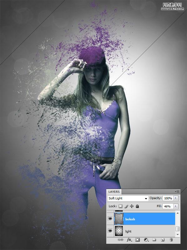 然后再使用一些煙霧的筆刷,在女孩的右下角我們描繪一些煙霧,然后圖層填充調(diào)整到 50%,效果如下。