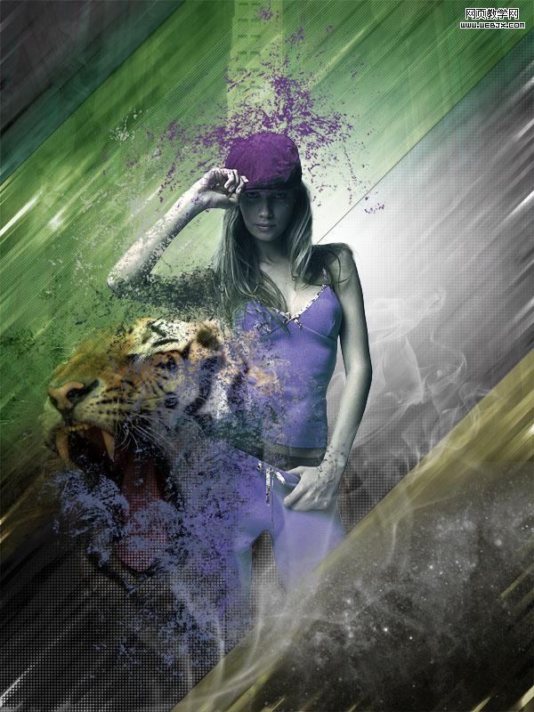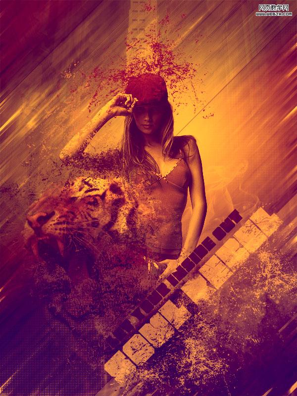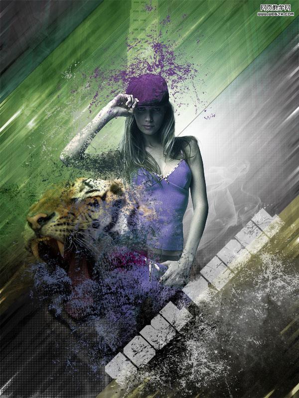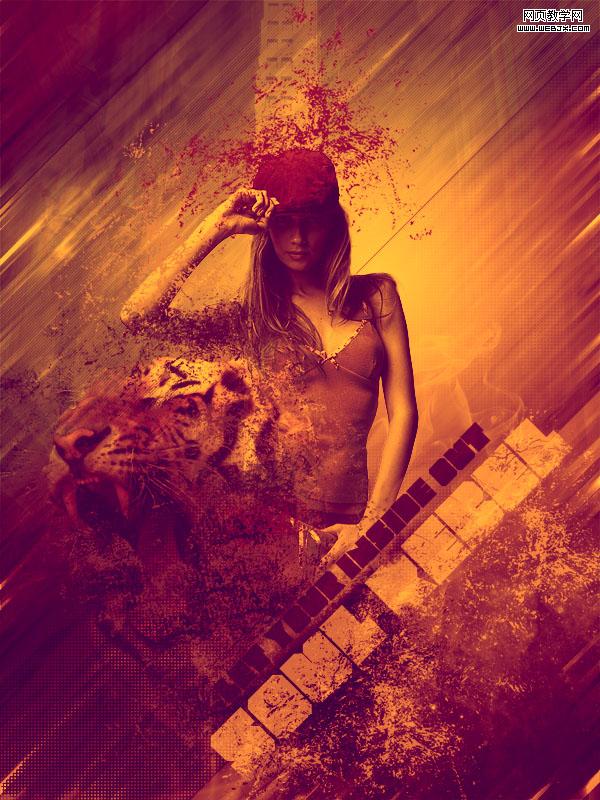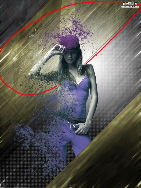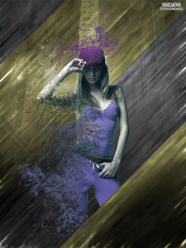 使用41 grunge brushes筆刷,然后在畫(huà)面左側(cè)使用和姑娘形象相同的顏色運(yùn)用筆刷。用吸管工具點(diǎn)擊姑娘選擇顏色,在剛才新建的圖層里狂涂一下。最后你應(yīng)該看到如下效果:
