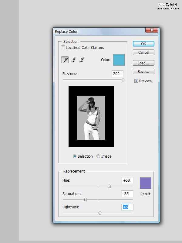 效果已經(jīng)不錯(cuò)了,但是這里我們使衣服的顏色更像帽子的顏色,執(zhí)行使用圖像>調(diào)整>替換顏色命令,把淺藍(lán)色部分替換為紫色。