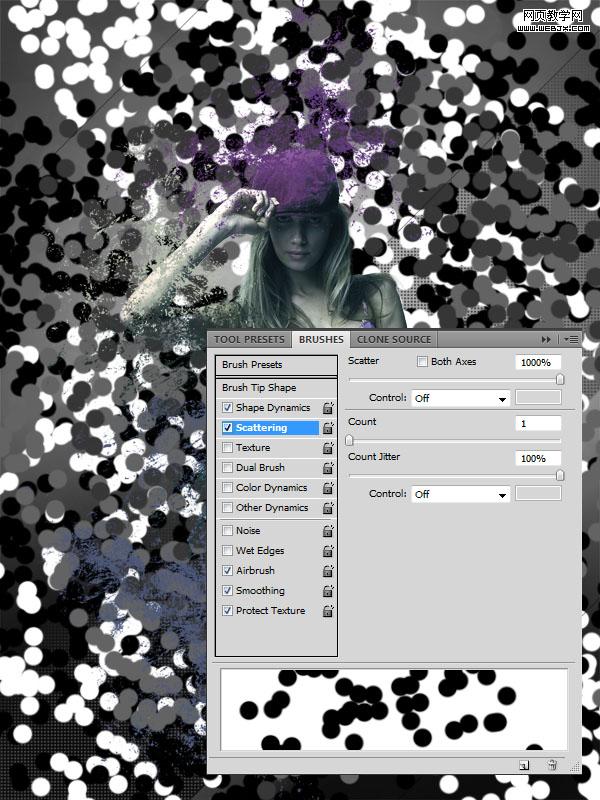 在女孩層下面創(chuàng)建一個(gè)圖層,然后使用畫(huà)筆,設(shè)置如下,繪制好多白色圓點(diǎn)和黑色圓點(diǎn)的圖案。