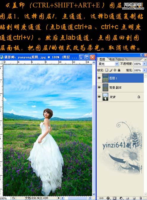 4、新建一個(gè)圖層,按ctrl + alt + shift + e 蓋印圖層。得到圖層1,選擇圖層1,點(diǎn)通道面板,選擇b通道復(fù)制粘貼到明度通道(方法:點(diǎn)b通道,按ctrl + a 全選,按ctrl + c 復(fù)制,點(diǎn)明度通道,按ctrl + v 粘貼。)。然后點(diǎn)lab通道,再回到圖層面板,把圖層1的圖層混合模式改為“柔光”。