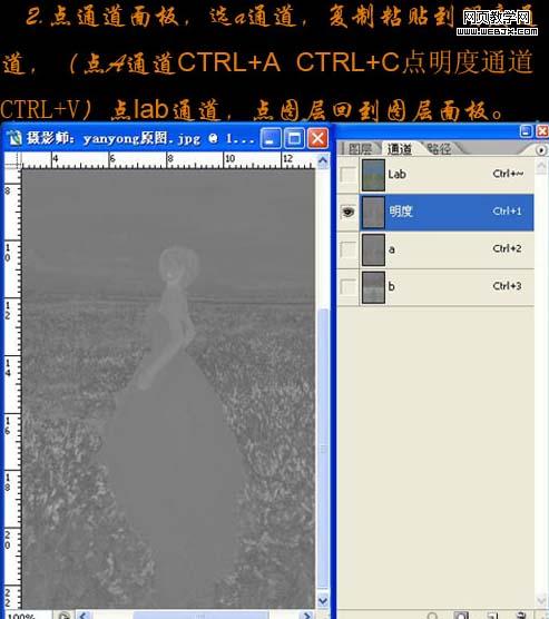 2、點(diǎn)通道面板。選擇a通道,復(fù)制粘貼到明度通道(點(diǎn)a通道按ctrl + a 全選,按ctrl + c 復(fù)制,點(diǎn)明度通道按ctrl + v 粘貼)。點(diǎn)lab通道,然后回到圖層面板。
