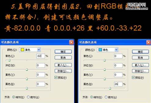 5、新建一個(gè)圖層,蓋印圖層得到圖層2,選擇菜單:圖像 > 模式 > rgb顏色,選擇不合拼。確定后創(chuàng)建可選顏色調(diào)整圖層,參數(shù)設(shè)置如下圖。