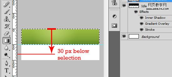 15 確認圓角矩形的選區(qū)始終存在,選中的圖層為 radial_gradient。確認標尺已經(jīng)打開,單擊漸變,從圖層頂部開始拉拽,結(jié)束點在選區(qū)往下30px的地方上。