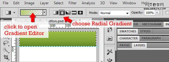 13 轉(zhuǎn)換到漸變工具 (g). 設(shè)定漸變模式為 徑向(圓形)漸變。單擊漸變條打開漸變面版。