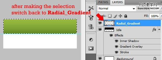 12 在idle圖層上,創(chuàng)建一圖層,命名為 radial_gradient。調(diào)整前景色為# b8cf69。按住ctrl 點擊 idle圖層,新建一圓角矩形選區(qū)。 之后轉(zhuǎn)換返回radial_gradient圖層。