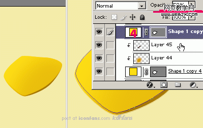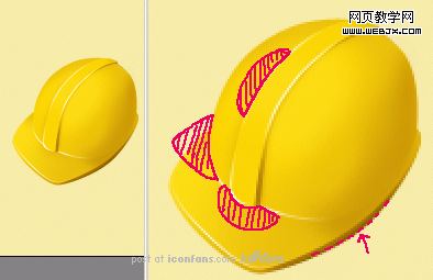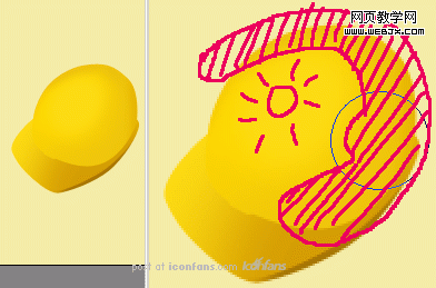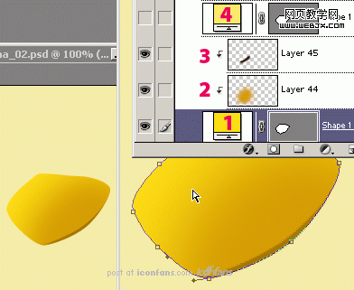 主體形狀部分取消隱藏并重新著色(#fddb13),再一次,創建新的圖層,與前者編組,并在標記的區域用大的軟的更黑的筆刷來繪制。這里沒必要做出一個很大的陰影….