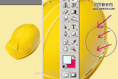首先,選擇所有形狀圖層的選區(ctrl+shift+點擊所有圖層),創建新圖層,縮小選區1像素(選擇>修改>收縮),并用大軟筆刷來畫背光,就像箭頭所示,用任何你喜歡的顏色,亮藍或紫羅蘭效果很好。