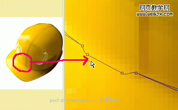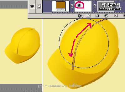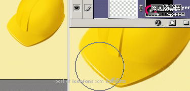 選擇鋼筆工具一步一步的描出頭盔的每個部分。我們從帽舌開始,不要擔心顏色,形狀最重要。為了能更加精確,最好調整一下圖層透明度,你可以用小鍵盤來控制,舉例來說,5就是50%透明度,當你開始描的時候,確保你畫的是形狀圖層,這樣你在后面才能修改它。記住因為我們只是描的帽舌部分,所以被帽子擋住的那部分不必描那么精確。(我們在后面不會用到那部分的)