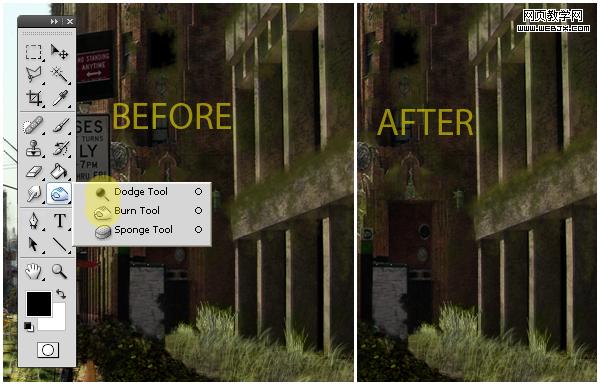 使用加深工具給墻添加一些陰影。
