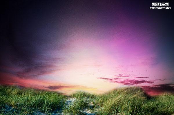 創(chuàng)建一個新圖層sky gradient overlay,然后設置漸變效果,填充畫布,然后降低圖層透明度到50%,改變圖層模式為疊加,效果如下。