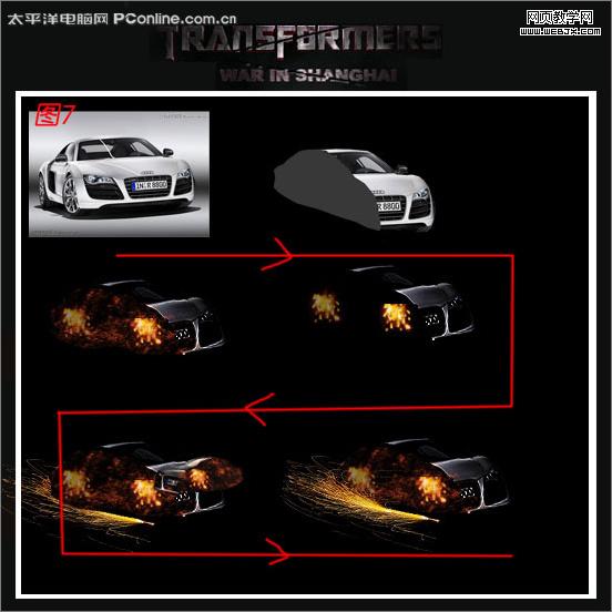 找2張r8左邊和側(cè)面的圖,從中間進(jìn)行刪除處理,將前景色設(shè)置為灰色,填充切掉的部分。打開火焰素材2,ctrl+t,縮小后放置到發(fā)動(dòng)機(jī)處,同時(shí)新建立一層,前景色紅色,隨意涂抹,執(zhí)行菜單—濾鏡—模糊—動(dòng)感模糊,制作燃燒效果;然后打開火花素材,ctrl+t調(diào)整好位置,放置到汽車下面,ctrl+j復(fù)制一層,放置到汽車上面,同時(shí)將r8汽車層進(jìn)行降低曲線和色階處理。最后將2半的車,按照透視比例放置到合適的位置上。如圖7。