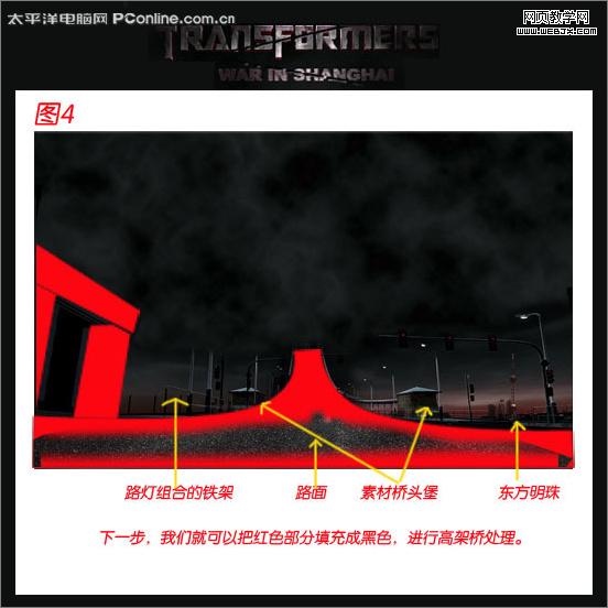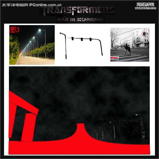 d、打開素材2,用多邊形索套工具勾勒出路面部分,放置到紅色上,裁減合適的位置,按ctrl+shift+u進(jìn)行去色,然后調(diào)降低曲線;打開素材1,多邊形索套工具勾勒出城市大樓的部分,將上下進(jìn)行羽化,放置到路燈后面,做遠(yuǎn)景背景,同時(shí)找一張東方明珠的素材,摳圖后ctrl+t縮小到比例合適的位置;再將剛才的路燈進(jìn)行適當(dāng)?shù)淖冃翁幚恚龀鲎筮叺匿摴埽瑫r(shí)找一些小房子素材做橋頭堡,如圖4。