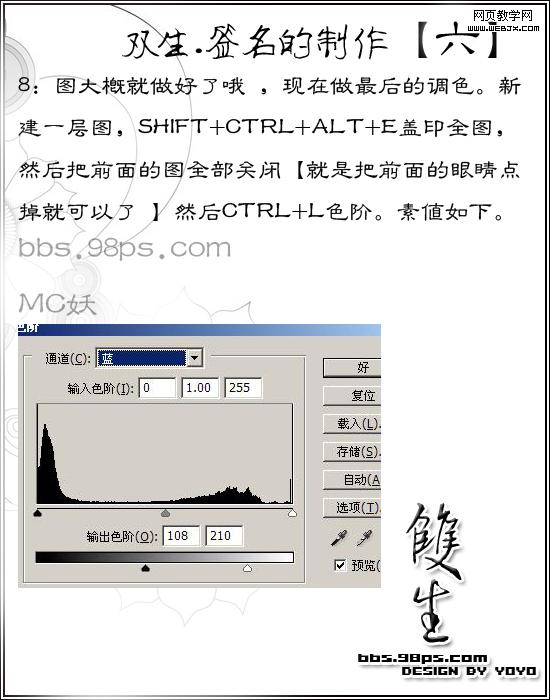 八.圖大約就做好了喔,此時做最終的調節色,創建一層圖,shift+ctrl+alt+e蓋印整圖,之后將之前的圖全部關掉(就是點掉之前的圖眼睛就可以了).之后ctrl+l色階,設定值如下: