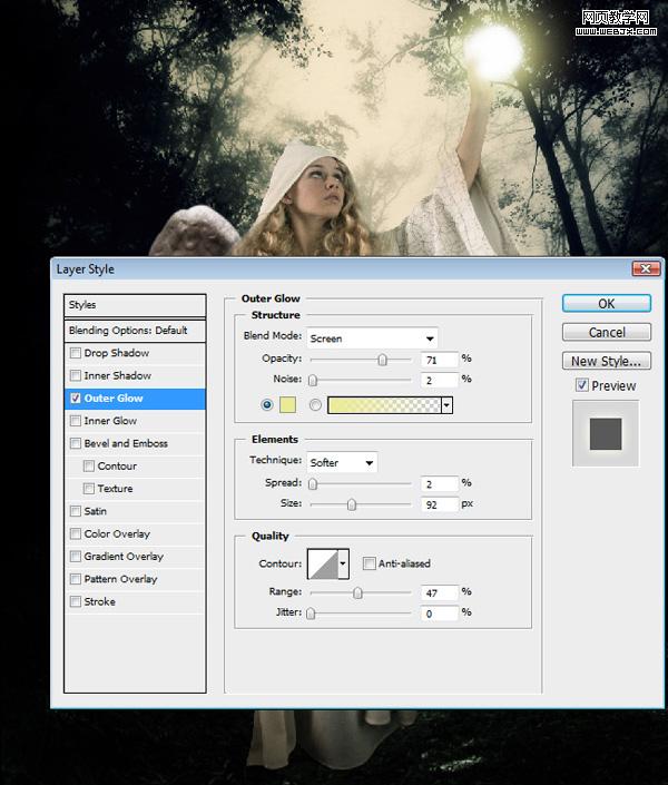 使用外發光屬性制作光輝效果,顏色為金黃色,參數如下: