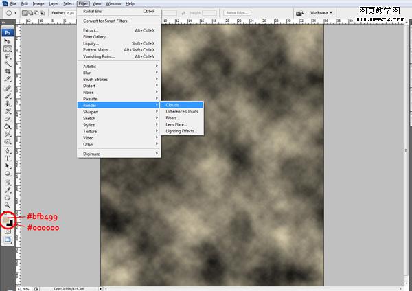 創建一個新層,將前景色設為# bfb499,背景色設為黑色。 使用濾鏡>>渲染>>分層云彩 得到云層混合效果