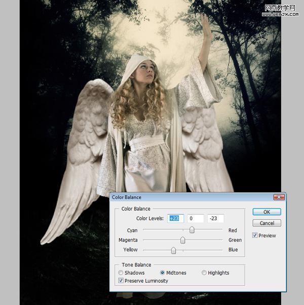 轉到圖像“調整”色彩平衡和使用下面的設置(因使用的并不是原文中的翅膀素材,所以參數可以適當靈活調整)。 可以使用亮度/對比度 適當增強翅膀的敏感對比,必要的時候可以使用加深工具對局部陰影部分加深