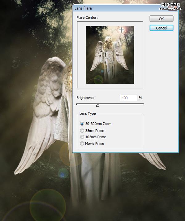 這是最后一步。 使用ctrl+shift+alt+e (cs3版本后的功能),如果您的版本較低請直接ctrl+a全選>>ctrl+shift+c復制全部>>ctrl+v粘貼即可,然后使用鏡頭光暈,按照下圖設置創造光暈效果,確定后,使用軟橡皮擦,擦除多余的光圈如圖所示: