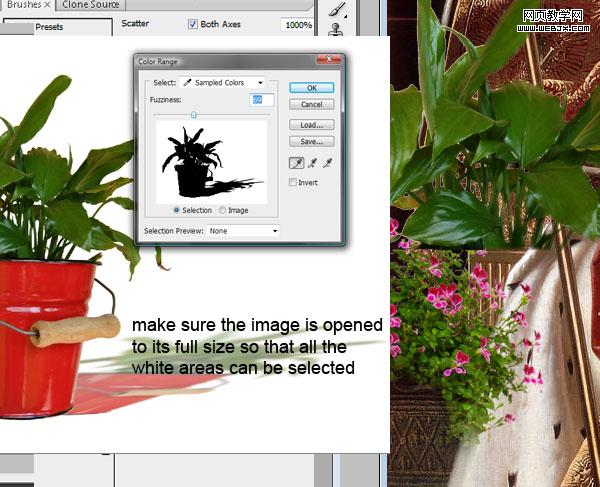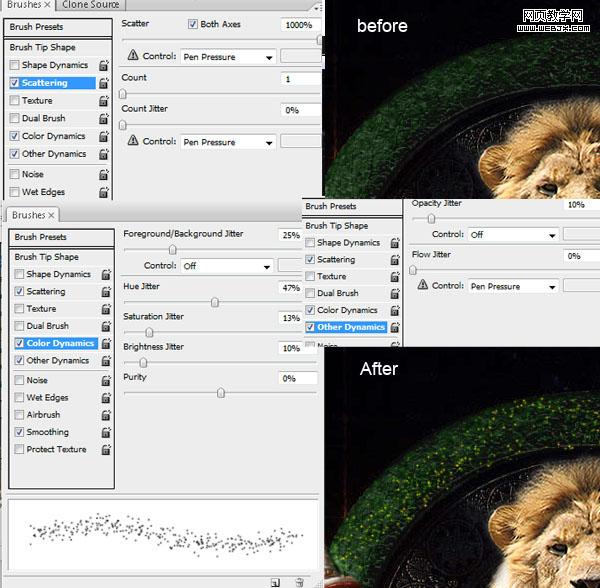 我們將增加植被使王位看起來更有叢林感。首先添加一些綠化元素使其更豪華。然后打開通道>>按住ctrl+左鍵選擇綠色通道(得到選區)。新建一個圖層 將畫筆設為3px大小,按下圖所示調整它的“散布”“顏色動態”“其他動態”