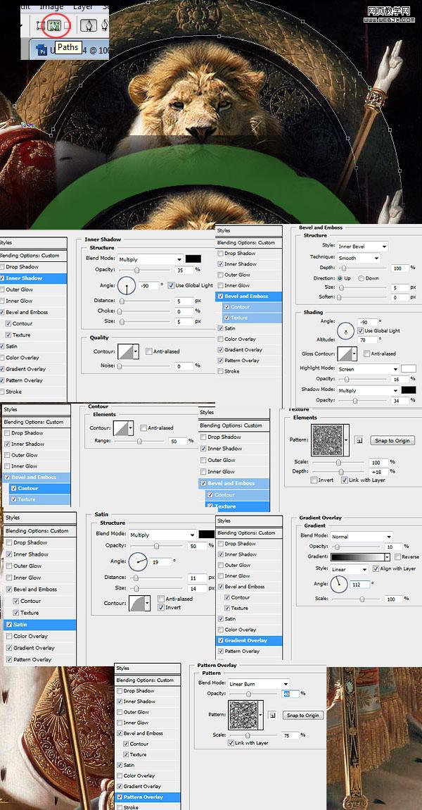 創建一個新的層(按ctrl + shift + n )。用鋼筆工具(p)沿著王位上部分弧形進行描繪并轉換為選區填充為綠色。