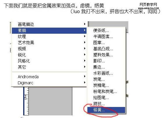 | 11、下面我們就是把金屬效果加強點。執(zhí)行:濾鏡 > 素描 > 鉻黃。 |