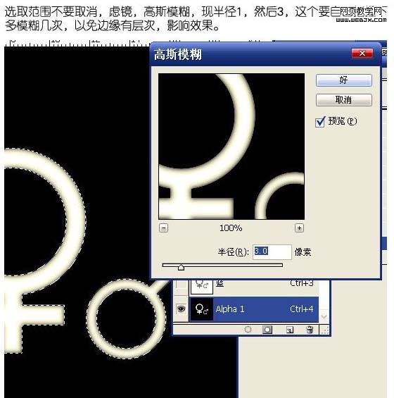 | 5、保持選區(qū)不變,點新建的通道,執(zhí)行:濾鏡 > 模糊 > 高斯模糊,數(shù)值為1,確定后再執(zhí)行一次模糊操作,數(shù)值為3,這個要自己把握下,多次模糊幾次以免邊緣有層次,影響效果。 |