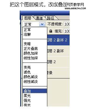| 13、確定后把圖層混合模式改為“疊加”。 |