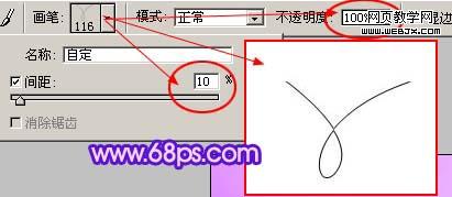 9、把前景顏色設(shè)置白色,選擇畫(huà)筆工具,選擇剛才定義的筆刷,參數(shù)設(shè)置如圖15,然后再選擇鋼筆工具在路徑上按右鍵選擇“描邊路徑”,得到圖16所示效果。