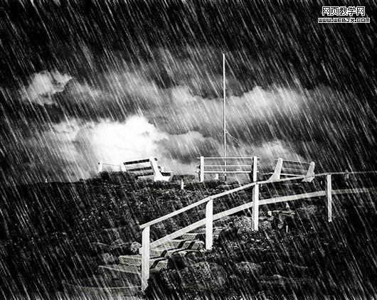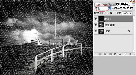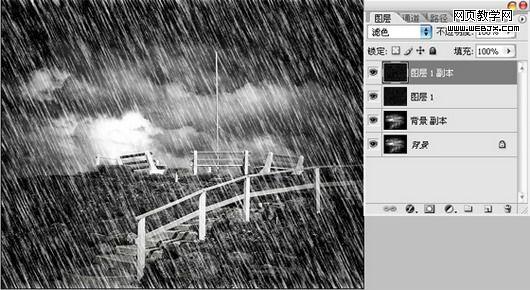 本文中運用了濾鏡中填加雜點和動感模糊來制造雨水的效果,再運用改變模式來融合背景中,在最后的背景復(fù)制到最上層并且用柔光模式更能體現(xiàn)出整幅圖片融洽的效果。
